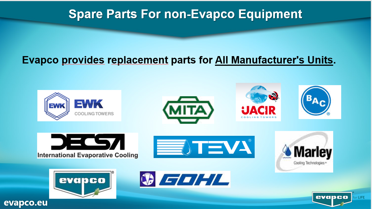 Firma EVAPFLEX Sp. z. o.o. jako jedyny oficjalny Przedstawiciel Firmy EVAPCO w Polsce posiada szeroki wybór części zamiennych do urządzeń wyparnych. W odpowiedzi na potrzeby rynku dostarczamy części wież chłodniczych / skraplaczy amoniakalnych nie tylko produkcji EVAPCO, ale również innych Producentów (BAC /Marley (SPX)/Imeco/Ceramic /Spectrum/Frick /innych).